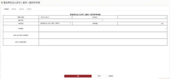 3.申領人根據需求填寫《事業單位法人證書(副本)復印件申領表》,并提交申請;其中申領事由需如實填寫,復印件左下方會寫明“此件僅限于辦理+‘申領事由’”。