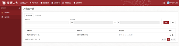 4.申領人申請后,可從“任務中心-我的申請”中查看本人申請及申請狀態;申請經本單位主要負責人審批、學校辦公室復核后,可憑身份證或賬號密碼(賬號為工號,密碼為身份證號后六位)前往自助打印機登陸自助打印系統,進入“預約模式打印”,進行事業單位法人證書證復印件的自助打印。
